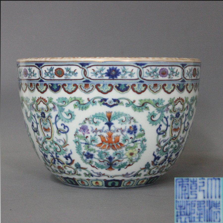 官窯鬥彩卷缸,器型規整,胎體潔白細膩,撫之若脂,愛不釋手。外壁白瓷為紙,鬥彩施畫,線條流暢,清勁典雅,疏密得當,濃淡相宜。乾隆重器,傳世佳品,殊為珍惜