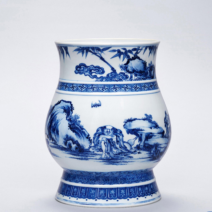 本品以周漢銅壺為形,端莊古雅,通體紋飾以青花繪就,層次清晰井然,口沿前後分別裝飾靈芝竹石圖和禽棲洞石圖,並以留白凸起的弦紋線、“卍”字紋與金錢紋上下分隔展現主題紋飾:蓬頭四仙圖。畫中所繪鐵拐、劉海、寒山、拾得四仙,禿頂披發,因皆不施巾幘,謂之“四蓬頭”。畫中四仙佈置錯落,姿態各殊,形骨古野,怪戾駭俗。正麵在祥蝠之下抱膝而睡的是鐵拐李,身邊傍依著大葫蘆。左側奔跑相告的是寒山,另一麵繪出翹腿坐於古鬆樹下的是拾得,與之對語者則是劉海,肩上伏蹲的金蟾吐出一道金錢仙氣,神秘而有趣。縱觀全圖,放筆縱墨,輕盈飄逸,諸仙情勢俱佳,形象詭怪,得妙趣於天然,一如明初名家商喜之作《四仙拱壽圖》,運筆剛勁有力,氣勢挺健,飽滿而富有彈性;衣紋走勢棱角分明、瀟灑利落,自見飄逸之氣。對四仙的嘴、眉、顴骨均加以強調,使形象更具沖擊力和生命力,尤其對嘴部的誇張錶達,突出了“笑”態,增強了畫麵的喜慶氣氛,予人觀之,忍俊不禁,深受感染。與高超的人物技法相匹配的山石諸景同樣引人入勝,山石蒼潤,皴法儼然,運筆穩健而鋒芒淩厲,結構跌宕多姿,富有變化。古鬆橫欹生姿,遒勁盤麯,前後呼應,為構圖增添空間感。青花一色於不同技法運用之下各見風韻,時而淡如浮雲,時而重若濃墨,時而緩似流水,時而急像飛瀑,運筆所至處,俱含意蘊,縱觀雍正一朝青花禦瓷之中未見有出其之上者,是為一絕。