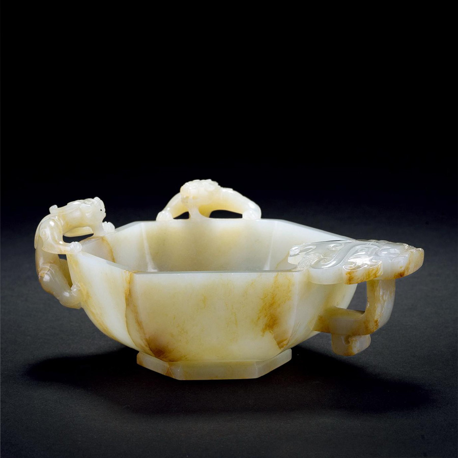 說明:此杯白玉質,呈六棱形,內挖精細。內壁素潔無紋,杯口盤覆螭龍兩隻。螭龍背部麯張,四爪攀附口沿、杯壁,強勁有力,栩栩如生。杯柄中空,摺沿方正規矩,柄上雕刻饕餮紋,古韻盈然。整器做工精湛細膩,刀工流暢,線條簡練,可謂鬼斧神工,實為玉製珍品。