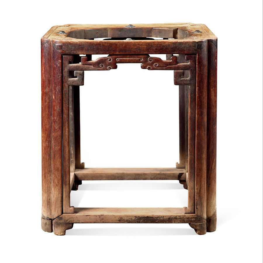 火盆架伴隨火盆出現,與古代生活方式息息相關。傳統建築以梁架架構,牆壁多以木闆拚接填充,保暖性較差。因此在嚴冬之際,普遍採用攜帶式的火盆,以供局部性的取暖之用。火盆的使用相應的設計了置放火盆的架子,成為獨立的一類家具。火盆架亦可用作火爐,用來溫酒,或準備小食、點心。此件火盆架以黃花梨木製,平麵倭角正方,頂麵圓形洞穿,用以嵌入火盆。邊抹正中,各有一個凸起的銅乳釘,用以支撐盆沿。四腿之間,裝飾有卷雲紋花牙,近足處插有腳棖。好的明式火盆架存世稀少,王世襄在一九八九年編寫《明式家俱研究》時曾感歎“多年隻見一例……後來所見亦僅一二”,足見其珍貴。