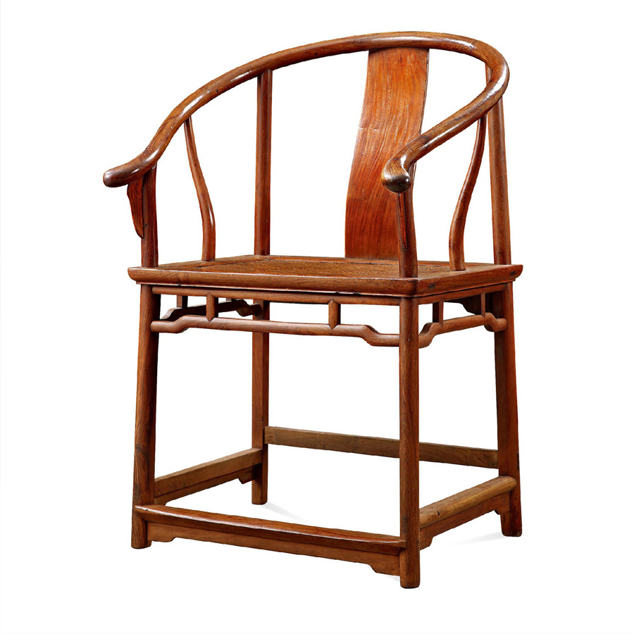 此圈椅为黄花梨制成,椅圈五接,木条浑圆,形如开弓,三弯形鹅脖出榫纳入扶手下方及椅盘抹头,扶手与鹅脖间打槽嵌入小角牙。靠背板为一块整板,呈S形。座面作藤编软屉,面下置穿带,边抹冰盘沿。四腿之间设有罗锅枨,两矮老与牙条相连。椅腿侧脚收分明显,足间步步高赶枨,寓意步步高升。圈椅在中国古典家俱椅具类中应该是设计和使用结合的最为完美,如若倚坐其中,手臂可同时得到支撑,空气流通以解酷夏暑期,优美的线条及坐靠的舒适性是其他椅具不可比拟的。该对圈椅包浆温润,整体造型简练舒展,稳重大方,装饰适度,可谓清早期明式圈椅的标准器。