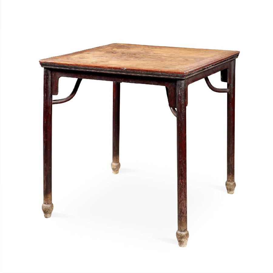 此件方桌黃花梨製,桌麵以一木對闆雙拚而成,邊抹均等,冰盤沿三層,嚮下漸收。桌麵底部裝穿帶,加以霸王棖加固。四腿足筆直而下,上有榫頭鏈接邊抹,下部近足有凸起,一木連做,有如立柱安置柱礎,這種設計在王世襄《明式家具珍賞》第139頁的明代黃花梨有束腰矮桌展腿式半桌亦有體現,多出現在明代家具之上。桌麵和腿足之間,有牙條牙頭,豐富了桌腿的結構。整體線條利落清爽,簡化至極,充滿明式家俱設計美學。方桌文氣精巧,其桌麵尺寸較小,不類一般廳堂所置,應當是用於文人書房飲茶、對弈所用。