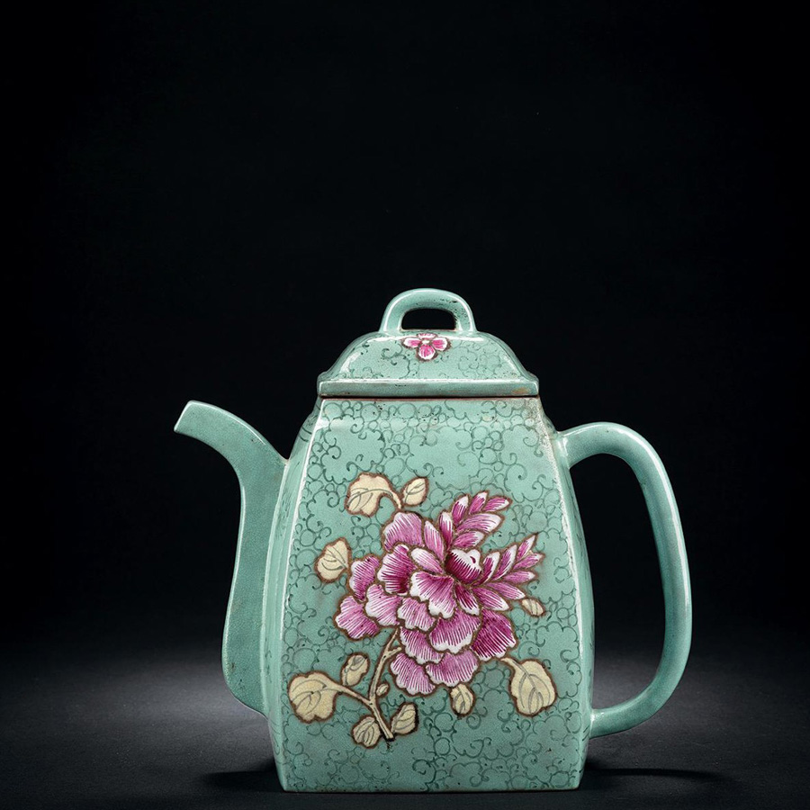 此壺方形壺體,把圈長碩,蓋頂橋鈕,為典型漢方壺式。壺外壁通體滿掛仿綠鬆石釉,釉質肥厚,釉色淡雅,並加墨彩勾繪仿造天然綠鬆石特徵,為乾隆朝以瓷仿他物的象生瓷特殊品種,甚是逼真。壺身兩側,一麵彩繪牡丹紋,一麵繪秋葵紋;另兩麵以蘭草裝飾,紋飾豔麗多姿,與淡雅鬆石釉形成鮮明對比,實為華鳳翔神品之作,極為珍罕。壺底鈐印篆書“荊溪華鳳翔製”六字款。華鳳翔,清康熙至雍正(公元1644-1722年)年間人,善仿古,所製壺精雅而不失古樸風味,兼長紫砂爐均,所製仿漢方壺精美絕佳,巧妙而不纖,工而能樸,款識以方章“荊溪華鳳翔製”落之。荊溪,宜興縣南,以近荊南山得名。晚明的名士張岱在崇禎十一年《陶庵夢憶》中《閔老子茶》一文中提到:“明窗淨幾,荊溪壺,成宣磁甌十餘種,皆精絕。”文中“荊溪壺”即指宜興紫砂壺。在晚明已稱紫砂壺為荊溪壺,清初的製壺藝人落款時落上“荊溪華鳳翔製”即為此證。南京博物院收藏有“荊溪華鳳翔製”陽文篆書印章款爐鈞釉高漢方壺,可供藏家參考。
